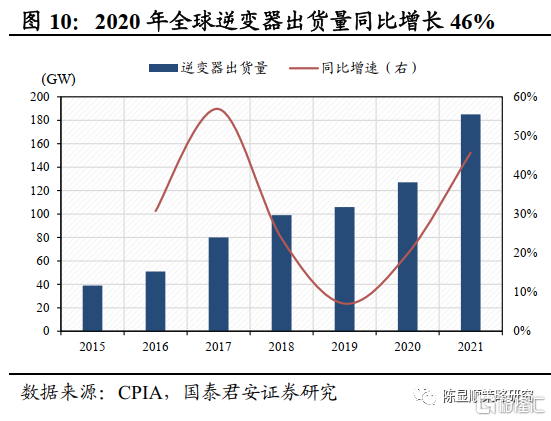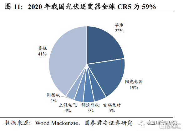 ▶ 逆變器:儲能技術發展帶來增量需求,國內廠商競爭優勢明顯。光伏逆變器可將光伏太陽能板產生的可變直流電壓轉換爲市電頻率交流電,是光伏發電併網的必備組件。光伏逆變器大體可分爲集中式、組串式和集散式三類,其中用於大型光伏電站的集中式逆變器以及用於戶用及工商業分佈式光伏系統的組串式逆變器爲市場主流,兩者合計佔比95%。近年來,受益於光伏裝機量的提升,光伏逆變器需求快速增長,據Wood Mackenzie統計,2020年全球逆變器市場出貨量爲185GW,同比增長46%,考慮到光伏行業整體處於高速成長期,且儲能技術的快速發展帶來增量需求,預計逆變器行業高增長仍將持續。我國逆變器行業經歷了多輪洗牌,現存企業有着很強的產品升級迭代能力,優質的服務與快速的響應能力,並在全球有着完備的銷售渠道,具備極強全球競爭優勢。2020年我國光伏逆變器前五大廠商出貨量佔全球59%,其中華爲、陽光電源累計出貨金額已超100GW,是全球前二的逆變器龍頭企業。