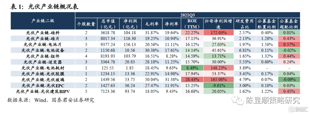 光伏盈利能力最優的環節點集中於上遊硅料以及光伏玻璃行業,具備上下遊一體化優勢的龍頭企業最受公募基金青睞。硅片、電池片以及組件行業市值較大,接近萬億規模。2021Q3盈利能力ROE水平較高的行業集中在上遊硅料(22.27%)、光伏玻璃(28.43%)行業。但公募基金的配置偏好與盈利能力的高低並不完全一致,具備一體化競爭優勢的龍頭企業更受公募基金青睞,例如“硅片+電池片+組件”一體化龍頭隆基股份(0.49%),“逆變器+儲能”龍頭陽光電源(0.29%)以及“硅料+電池片”龍頭通威股份(0.14%)