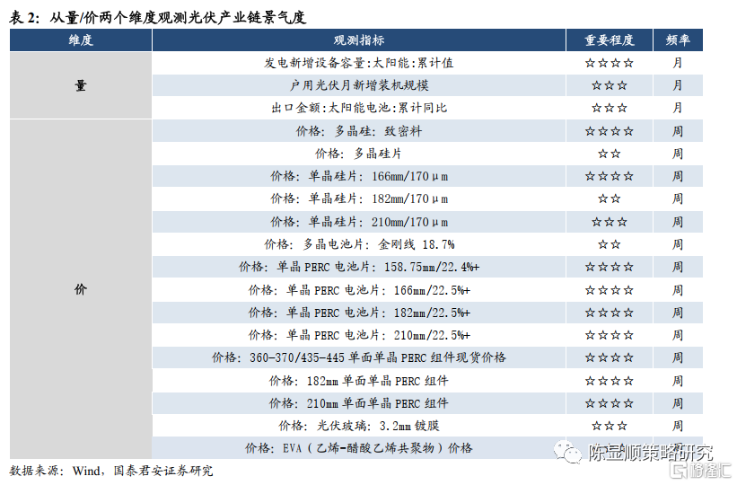光伏產業鏈景氣度可以從量、價兩個維度進行觀測。量方面主要跟蹤光伏整體、戶用光伏月度裝機規模以及太陽能電池月度出口金額。價方面主要跟蹤產業鏈各環節材料價格,例如多晶硅緻密料、單晶/多晶硅片、單晶/多晶電池片以及組件價格。除此之外,光伏玻璃、EVA等輔料價格同樣值得跟蹤。