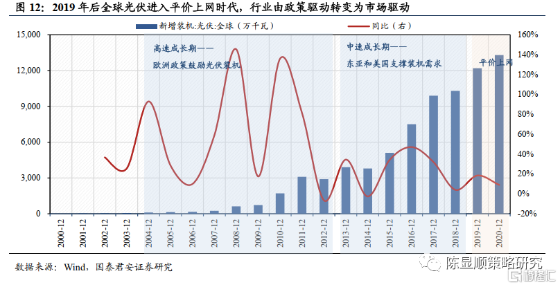 ▶ 高速成長期(2000~2012年)需求驅動力是德國、西班牙、意大利等歐洲國家用高額補貼推廣光伏裝機,這一階段光伏發電高昂,較火電沒有經濟性,需求依賴於海外政策補貼。全球年均新增裝機增速在60%以上,但波動極高。隨着歐盟對中國光伏啓動雙反調查,行業陷入產能過剩低谷。