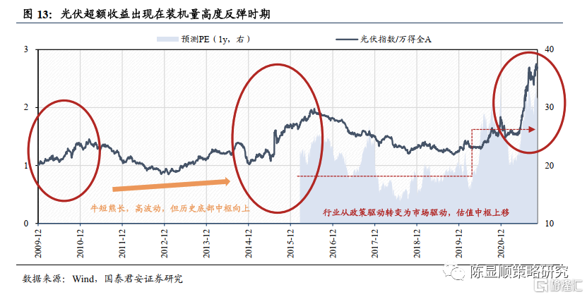 股市行情驅動力是裝機需求的週期性復甦。以2019年爲分水嶺,行業開始擺脫政策週期性走向內生成長,裝機需求由政策驅動轉變爲市場驅動。光伏行業景氣驅動力是全球裝機需求,以2019年爲分水嶺,通過多年的技術迭代和降本增效,光伏發電綜合成本開始低於火電,行業開始擺脫政策週期性走向內生成長,裝機需求由政策驅動轉變爲市場驅動。過去股市行情與全球裝機週期同步。當行業裝機需求進入反彈期時,光伏行業較萬得全A指數也會出現超額收益,如2015年、2020年光伏指數相較萬得全A均出現過翻倍的上漲。以往光伏行情與週期品類似,表現爲牛短熊長,高波動,但歷史底部中樞向上。當行業發展驅動邏輯轉變爲全球平價之後,需求不再由脈衝式補貼政策主導,穩定性提升,行業整體估值中樞整體上移。