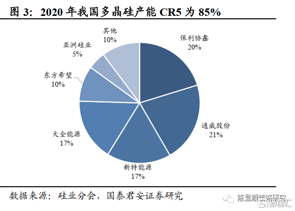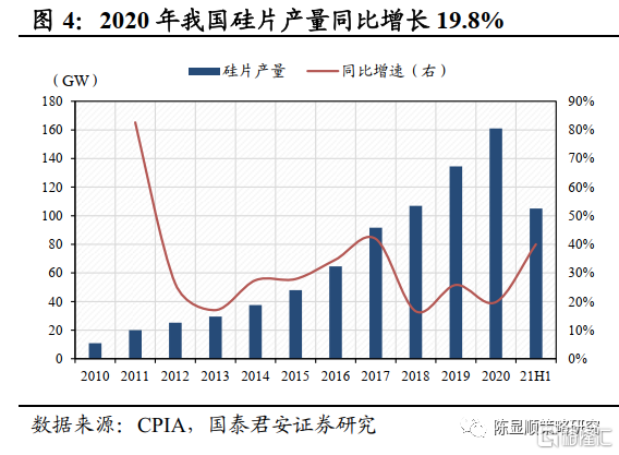 ▶ 硅料:產能釋放週期較長,供需錯配推動價格大幅上漲。多晶硅生產技術主要有三氯氫硅西門子法和硅烷流化牀法,產品形態分別爲棒狀硅和顆粒硅。據CPIA統計,2020年我國多晶硅產量39.2萬噸,同比增長14.7%,其中三氯氫硅西門子法生產佔比97.2%,未來仍將是主流生產工藝。相較於產業鏈其他環節,多晶硅具有產能投資金額大、技術工藝複雜、投產週期長等特點。今年以來,隨着疫情影響的逐步消退以及碳中和、碳達峯等相關激勵政策出臺,光伏裝機需求持續火熱,供不應求推動多晶硅料價格暴漲。2021年1月6日至2021年11月3日,光伏級多晶硅料價格由10.79美元/千克飆升至35.81美元/千克,漲幅近2倍,行業步入高景氣通道。集中度方面,當前我國多晶硅行業已基本完成洗牌,龍頭企業產能、技術、成本實現全面領先,2020年我國多晶硅產能CR5爲85%,排名前三的企業分別爲通威股份、保利協鑫以及新特能源。