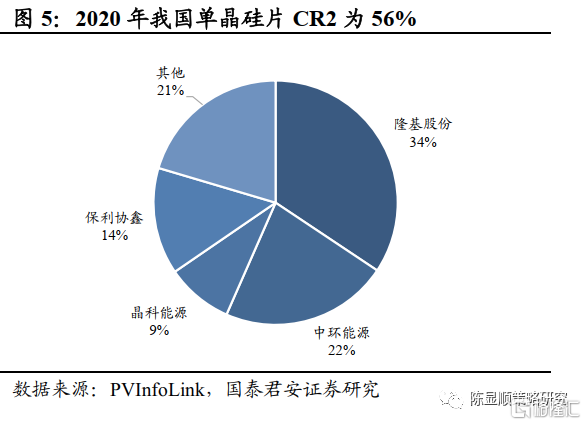 ▶ 硅片:單晶趨勢明確,雙寡頭壟斷格局延續。硅片主要有單晶和多晶兩種類型,單晶硅片相較多晶硅片有更高光電轉換效率,且在碎片率、機械強度上更優,現已成爲市場主流。據CPIA統計,2020年我國硅片產量161.3GW,同比增長19.7%,其中單晶硅片佔比90.2%,預計未來還將繼續提升。硅片行業市場集中度較高,呈現出隆基股份、中環能源雙寡頭壟斷格局,2020年兩者產能合計佔比約56%。近年來隨着硅片製造技術的逐步成熟以及單位設備投資額的持續下滑,行業進入壁壘不斷降低,吸引了許多新玩家入局,競爭加劇推動行業龍頭開啓一體化轉型,隆基股份向下遊電池片、組件環節延伸,中環也積極佈局疊瓦組件領域,預計未來一體化佈局將成爲行業未來的發展趨勢。