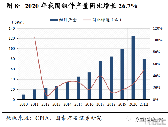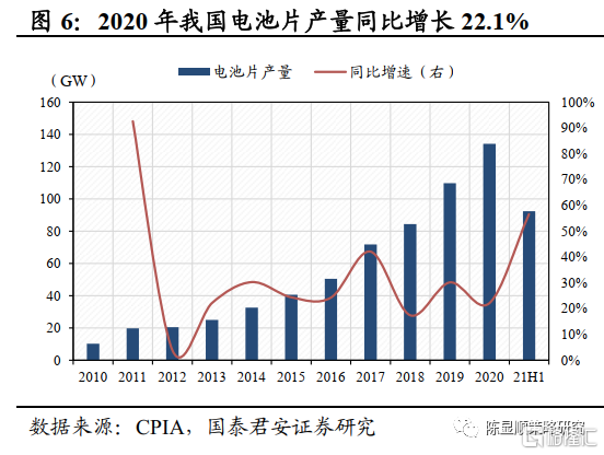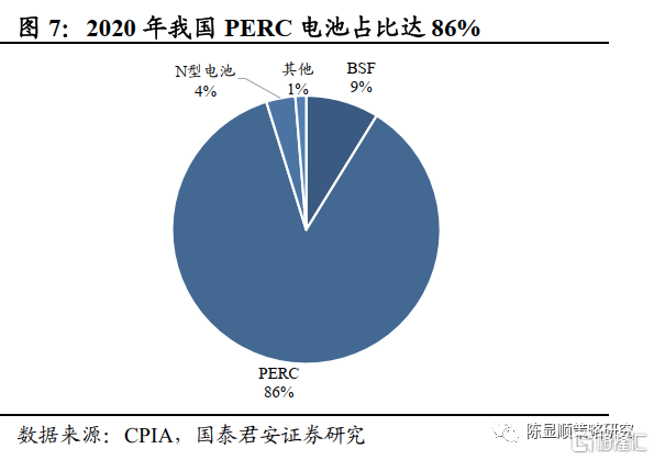 ▶ 電池片:PERC電池仍爲市場主流,N型電池技術逐漸成熟。電池片轉換效率提升是未來驅動光伏發電成本下降的核心,光伏電池片主要分爲P型和N型,以PERC電池爲代表的P型電池發展較爲成熟,是當前市場主流。據CPIA統計,2020年我國電池片產量134.8GW,同比增長22.1%,其中PERC電池佔比達86%。然而,當前PERC電池量產效率達22.8%,已逼近德國哈梅林太陽能研究所提出的24.5%理論效率極限,提升空間相對有限,而以HJT、TOPCon爲代表的N型電池可以有效降低光電轉換中的電損失,理論效率極限達28.5%、28.7%。2021年6月、11月,隆基股份N型TOPCon電池、硅基異質結電池相繼取得重大突破,創造了25.21%、26.30%的轉換效率記錄,N型電池技術正在逐步走向成熟。當前N型電池成本相對較高,量產規模仍較少,2020年產量佔比僅3.5%,較2019年小幅提升,未來隨着生產成本的降低及良率的提升,N型電池將會是電池技術的主要發展方向。