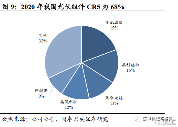 ▶ 組件:一體化佈局龍頭企業搶佔市場份額,行業集中度持續提升。相較於光伏產業鏈其他環節,組件加工生產技術相對簡單,一體化降本優勢顯得尤爲重要。同時由於組件下遊直接對接終端裝機需求,企業品牌、服務以及渠道也是其核心競爭力的重要組成部分。因此,具備品牌渠道優勢、上下遊一體化佈局的龍頭企業紛紛開啓擴產浪潮,持續搶佔市場份額。據CPIA統計,2020年我國光伏組件產量124.6GW,同比增長26.4%。我國前五大光伏組件廠商出貨量達86GW,佔全球光伏新增裝機量的68%,2019年這一比例僅爲45%,行業集中度呈現明顯的提升趨勢。