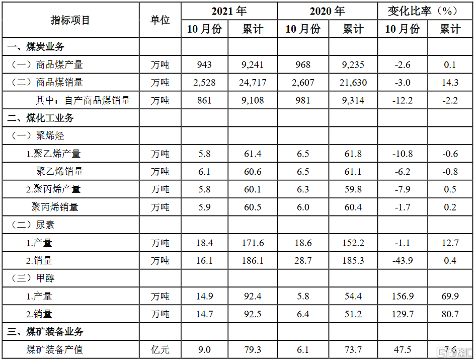 格隆匯11月12日丨中煤能源(601898.SH)發佈2021年10月份主要生產經營數據,煤炭業務方面,商品煤產量943萬噸,同比下降2.6%;商品煤銷量2528萬噸,同比下降3.0%,其中:自產商品煤銷量861萬噸,同比下降12.2%。