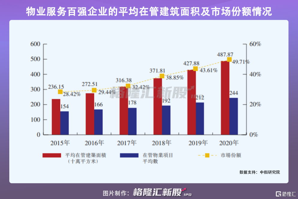 隨着城鎮化進程和人均支配收入持續增加,物業服務百強企業管理的建築面積和物業項目不斷增長,物業管理項目亦有向頭部企業聚集的趨勢。
