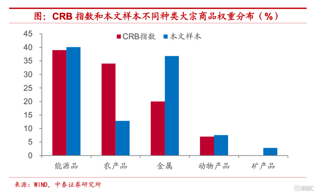 樣本囊括更爲豐富,包含品類達CRB兩倍。相比於市場使用較爲普遍的CRB指數,我們的樣本所包含的大宗商品種類更爲豐富,這樣可以在很大程度上避免對於整體趨勢的誤判。目前CRB指數包含19種大宗商品價格,涵蓋能源品、農產品、金屬和動物產品四大種類,而相比之下,本文所使用的樣本包含40種大宗商品,除了CRB指數中的四大類別以外,將鐵礦石、鋁土礦和磷酸鹽等部分金屬和非金屬礦產品價格也納入到樣本之中。