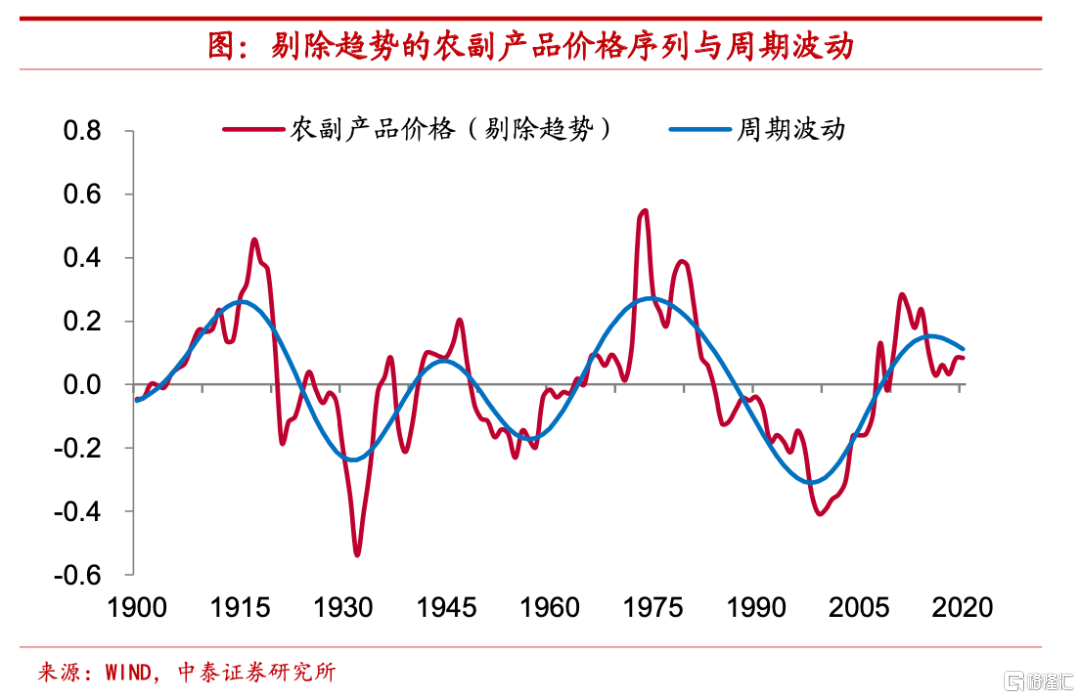 週期仍處下行時期,低點距今或有十年。而對剔除掉趨勢項的農副產品價格進行分析,我們發現,其同樣有着較爲明顯的週期規律,這一週期大約爲30-40年左右(前幾輪週期約爲30年,最近的這輪週期時間有所拉長)。從1900年以來的時間序列來看,農副產品實際價格的週期頂點共出現了四次,分別在1915年、1945年、1975年和2015年,而低點共出現三次,分別在1931年、1957年和1998年,和全球大宗商品價格的週期變化大體吻合。目前農副產品價格仍處於週期下行期,根據對歷史價格的週期波動規律演繹,我們預計下一次價格低點大約會在2028年-2038年出現,據目前有接近十年之久。