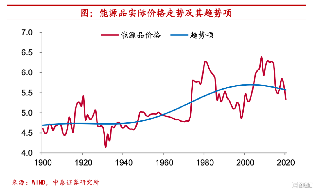 能源品實際價格,趨勢水平顯著上移。其次,我們來看能源品的價格變化,在長期趨勢上,能源品和農副產品的價格走勢截然相反,能源品的實際價格中樞在百年多的時間裏有着顯著上移。1900年時能源品價格指數對數的趨勢項約爲4.7,而2020年時這一指標已經接近5.6,較1900年約增長19%。