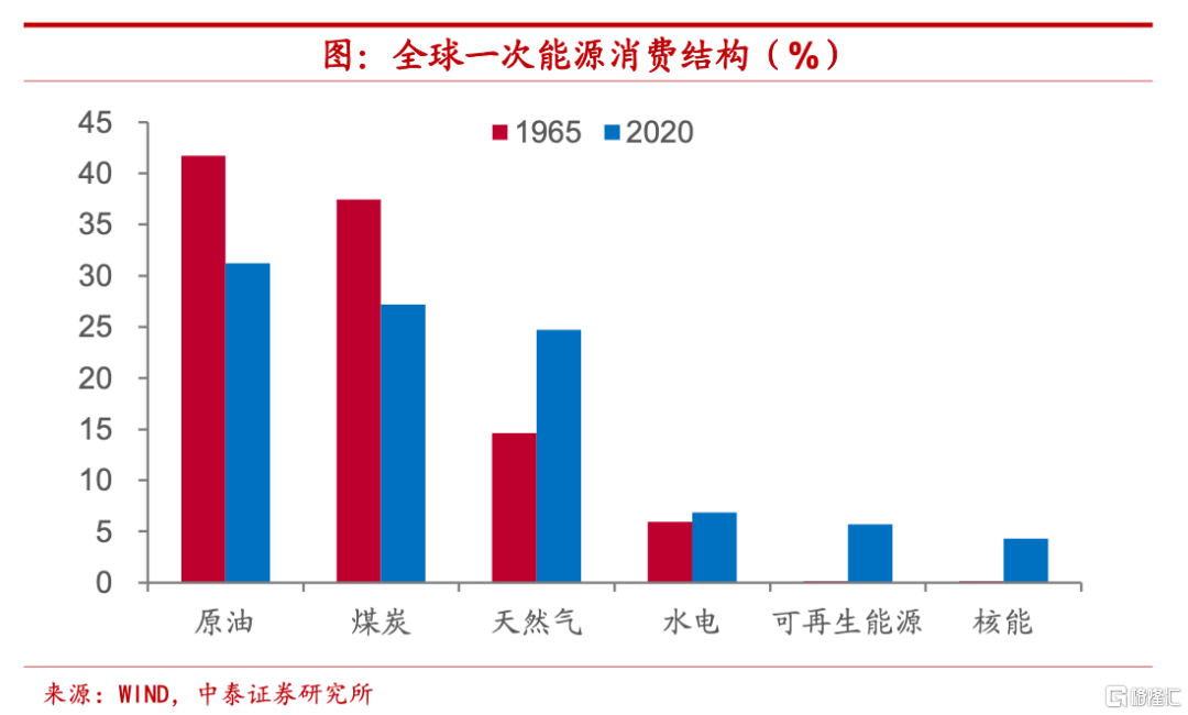 存量因素有所制約,替代商品相對稀缺。與農副產品存在顯著不同的是,能源品和礦產品主要通過開採來獲得,而非種植或培育,因而即便開採技術像種植技術一樣有所提高,其產量也不得不受到探明儲量等存量因素的約束。更爲特殊的是,能源品的替代品相對較爲稀缺,這也使得實際價格中樞隨着經濟發展而得以擡升。例如1965年時全球一次能源消費結構之中,原油、煤炭和天然氣三者佔比高達近94%,而即便經過五十多年,2020年三者在全球能源消費中的佔比依然高達83%,仍然是能源最爲重要的來源。