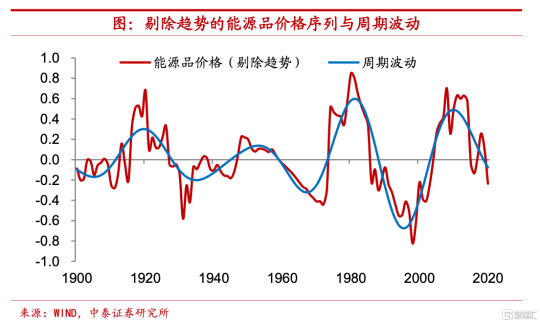 週期同樣處於下行,低點出現最快兩年。剔除掉趨勢項之後,能源品價格同樣存在着週期波動,其週期持續時間約在28-35年左右。從1900年以來的時間序列來看,能源品實際價格的週期頂點共出現了四次,分別在1919年、1953年、1981年和2010年,而低點也出現了四次,分別在1905年、1935年、1967年和1995年。從這一規律來看,目前能源品價格或也處於週期下行期,根據對歷史價格的週期波動規律演繹,我們預計下一次價格低點大約出現在2023年-2030年,距目前最快還有兩三年左右的時間。