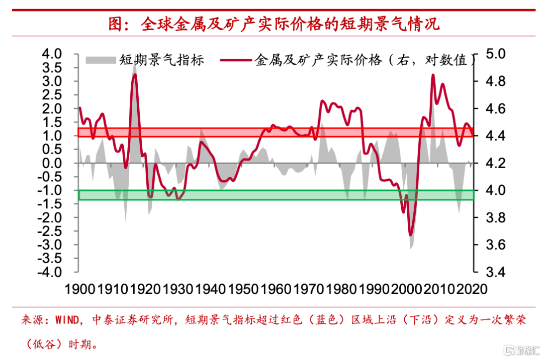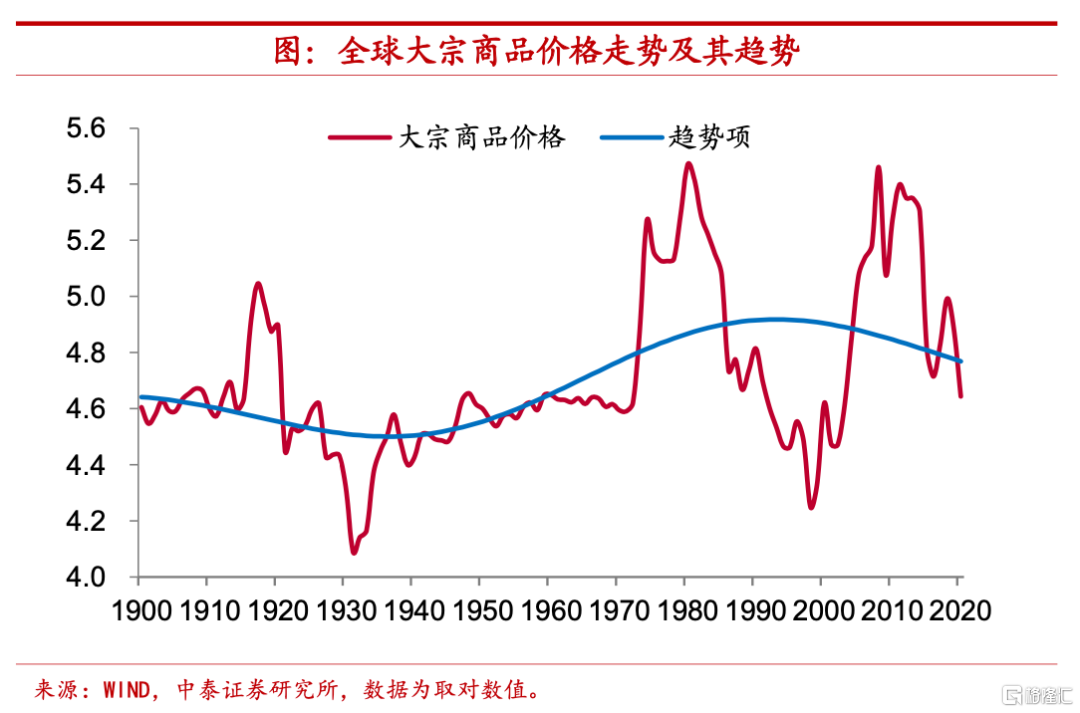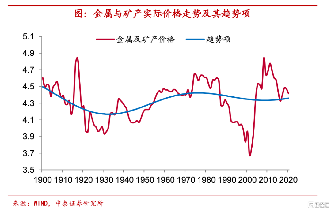 金屬及礦產品實際價格趨勢穩定。最後,我們來看金屬及礦產品的價格變化,從長期趨勢上來講,金屬及礦產品價格和農副產品、能源品均有不同,其百年多時間裏實際價格中樞基本保持穩定。1900年時金屬及礦產品價格指數對數的趨勢項約爲4.5,而2020年時這一指標已經略低於4.4,與1900年時的水平差距不大。