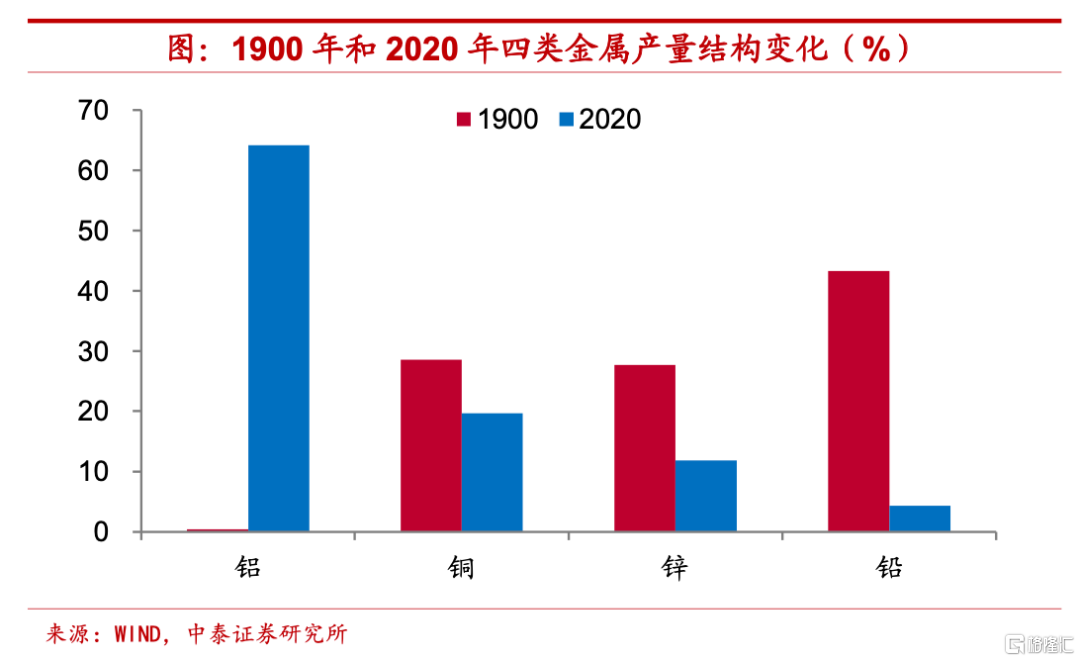 可替代性相對較強,產量結構變動顯著。雖然同樣作爲開採出的大宗商品,要受到探明儲量等存量因素的約束,但之所以金屬及礦產品實際價格趨勢並沒有像能源品一樣在百年多的時間裏顯著上移,我們認爲,其主要原因在於金屬及礦產品包含種類相對豐富,而相互之間的可替代性也比較強,需求並不依賴於某幾類特定品種。如以鋁、銅、鋅和鉛等四類金屬來看,2020年其產量結構和1900年發生了相當大的變化,鋁的產量佔比由1900年的不足0.4%攀升至2020年的超過64%,而鉛產量的佔比從1900年的超過43%降至2020年的僅4.3%左右。