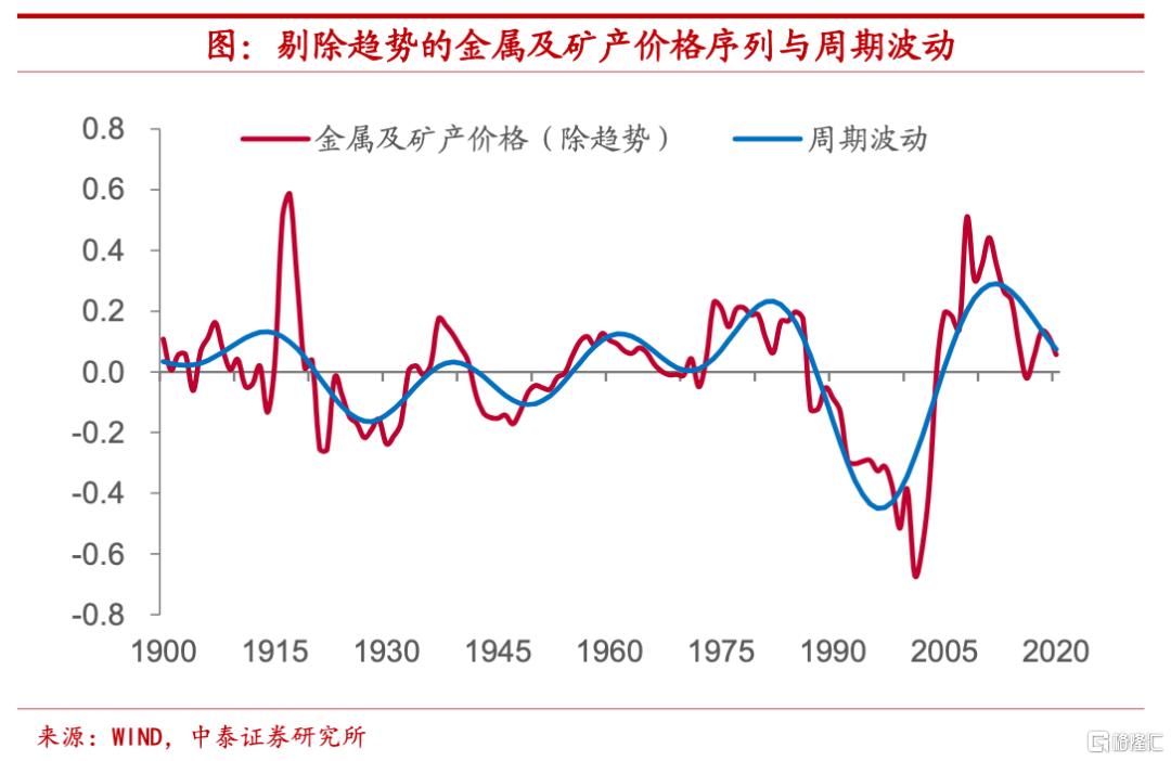 週期波動較爲類似,價格即將觸底反彈。剔除掉趨勢項之後,金屬及礦產品價格和農副產品、能源品存在着類似的週期波動,其週期持續時間約在20-30年左右。從1900年以來的時間序列來看,金屬及礦產品實際價格的週期頂點共出現了五次,分別在1914年、1939年、1961年、1982年和2012年,而低點共出現了四次,分別在1928年、1949年、1971年和1996年。從這一規律來看,目前金屬及礦產品價格很可能即將觸底反彈,週期低點或將較快出現。
