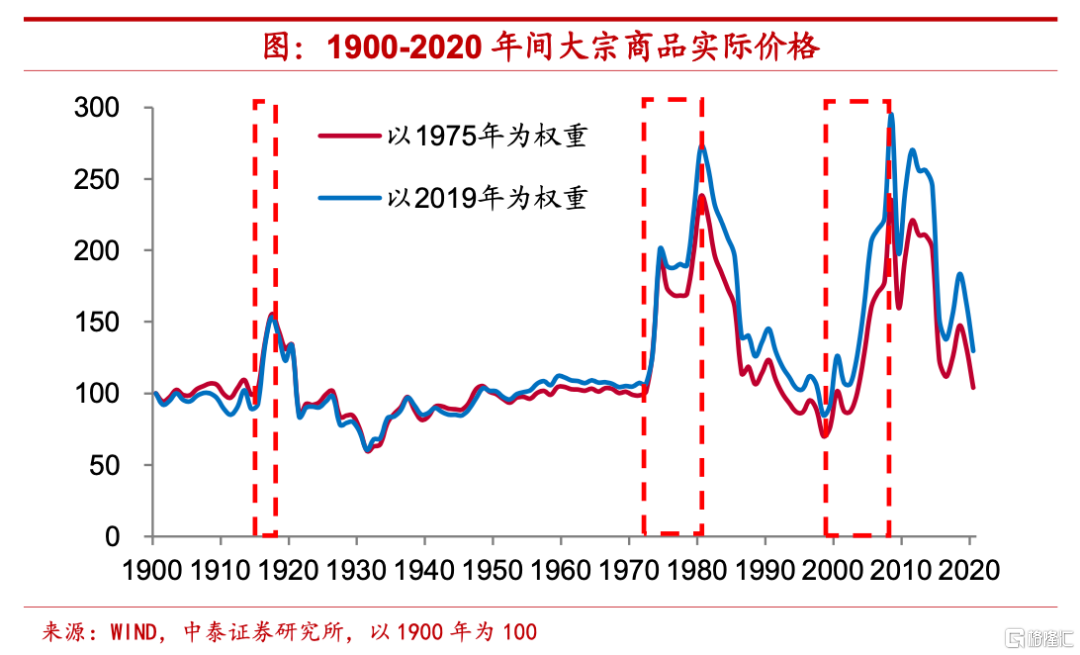 我們發現,不論是以1975年還是以2019年的商品產值作爲權重,1900年以來大宗商品價格共經歷了三輪大幅上升時期。