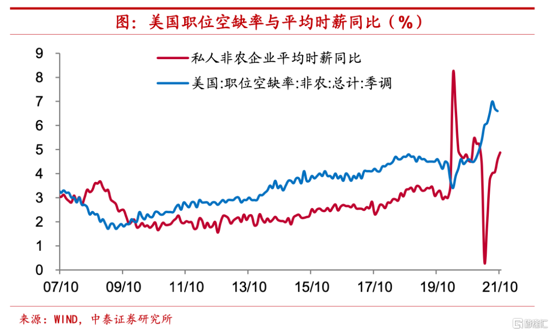工資決定通脹趨勢,增速難以快速下移。首先,宏觀層面對於大宗商品價格變化的關注很大程度上是源於其對通脹的影響,既然全球大宗商品價格週期仍然趨於下行,是否意味着通脹並無較大壓力?事實上,根據美聯儲近期工作論文的研究,勞動力市場短缺是決定通脹趨勢的主要因素,而大宗商品特別是能源品的價格變化,主要影響的是通脹水平圍繞趨勢的波動。從美國當前情況來看,結構性勞動力短缺依然比較明顯,季調後的職位空缺率保持高位,勞動力的就業參與意願仍然不高,這或將帶動美國的工資水平繼續攀升,美國通脹增速中樞很難快速下移。