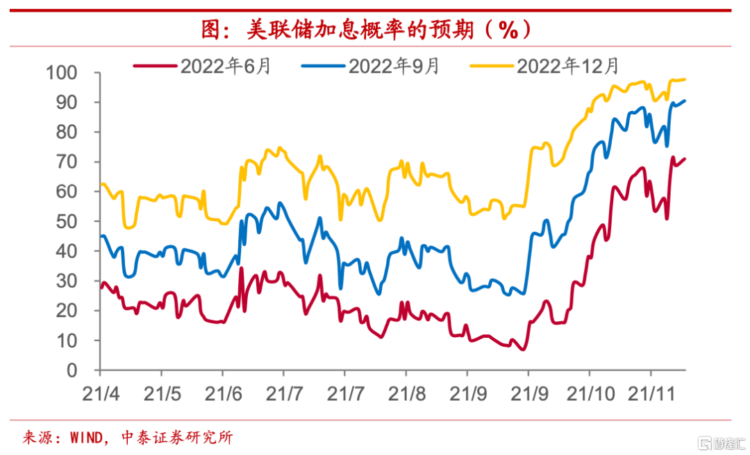 美聯儲貨幣政策被動轉向,明年加息概率加大。我們認爲,當前美聯儲貨幣政策的轉向很大程度上是通脹高企“倒逼”的被動調整,而不是經濟強勁復甦帶來的主動應對,這也就意味着,通脹水平的高居不下很可能使得政策收緊步伐有所加快。目前預期美聯儲明年加息的概率大幅上升。
