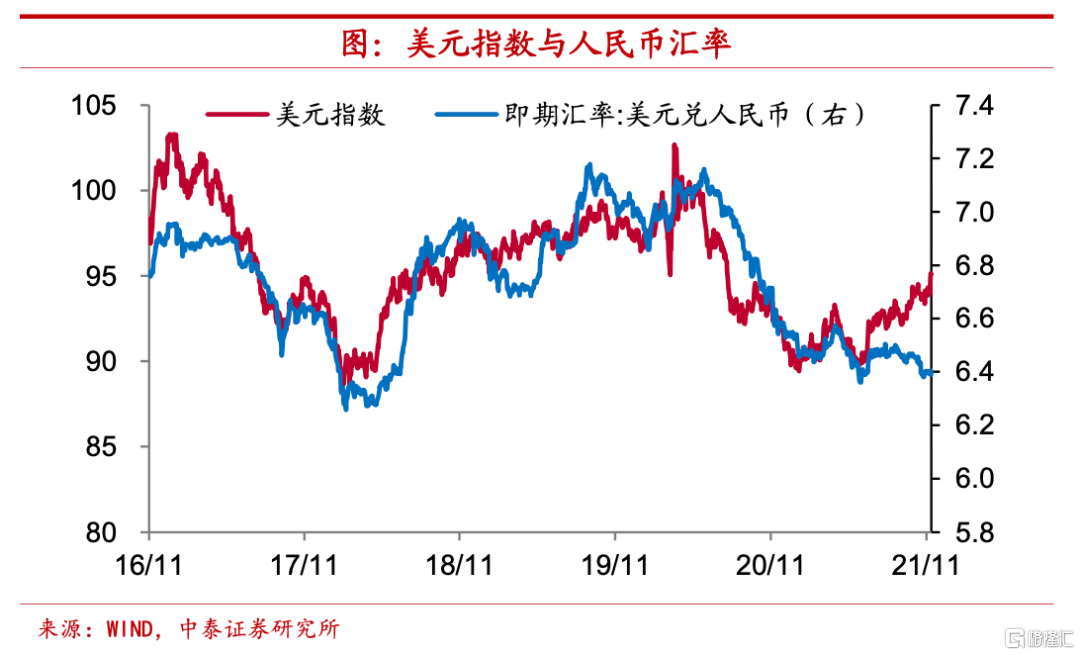 大宗價格變化或引發全球產業和區域結構調整。首先,宏觀層面關注大宗商品價格對通脹的影響,不過事實上,勞動力市場短缺而非大宗商品價格纔是決定通脹趨勢的主要因素。從美國當前情況來看,結構性勞動力短缺依然比較明顯,這或將帶動美國工資水平繼續攀升,通脹增速中樞很難快速下移。據此,我們認爲,當前美聯儲貨幣政策的轉向很大程度上是通脹高企“倒逼”的被動調整,而不是經濟強勁復甦帶來的主動應對,這也就意味着,通脹水平的高居不下很可能使得政策收緊步伐有所加快。目前預期美聯儲明年加息的概率大幅上升。而如果美聯儲選擇加息的方式來應對通脹上行,則意味着美元指數或將趨於走強,人民幣匯率恐將有貶值壓力。