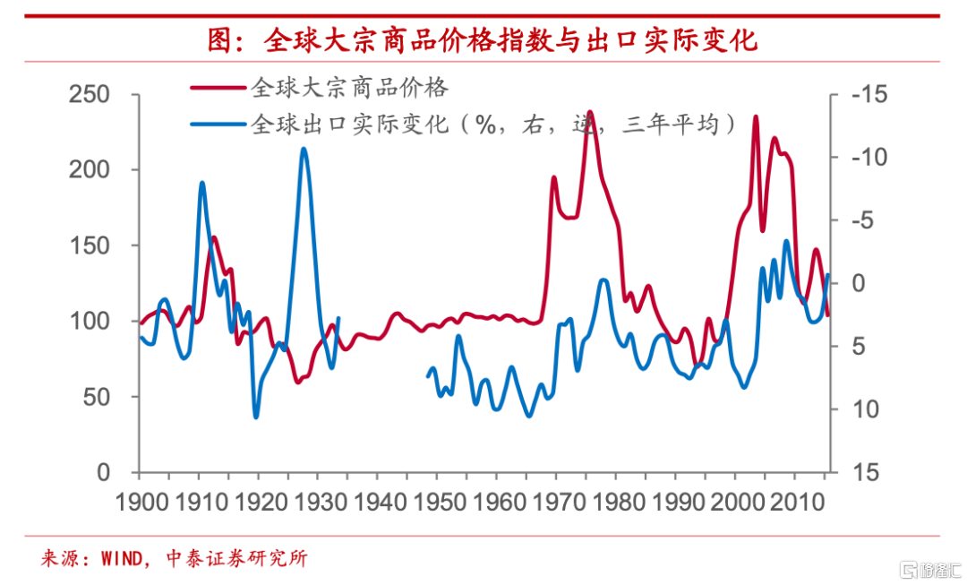 全球大宗商品實際價格仍處週期下行期。我們發現,1900年以來大宗商品實際價格共經歷了三輪大幅上升時期,分別在一戰前後、20世紀70年代至80年代初和20世紀末至21世紀初。而1970年是大宗商品價格波動的分水嶺在其後價格波動明顯加大。出乎此前預料的是,大宗商品價格多數時間裏和全球貿易變化呈現出此消彼長的關係。進一步地,我們從全球大宗商品價格走勢之中分離出不同時間尺度下的變化情況。