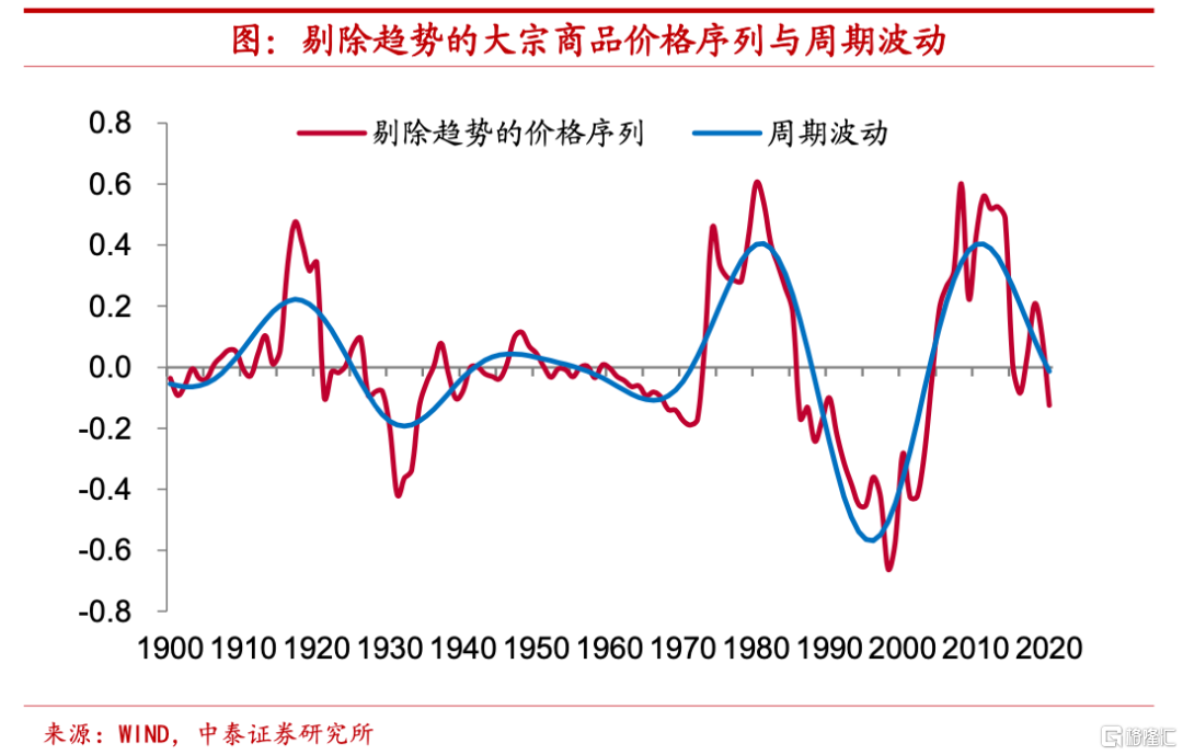 三十年的週期波動,低點出現五年之後。而在剔除掉趨勢項之後,全球大宗商品價格存在着較爲規律的週期波動,這一週期約爲30-35年左右,這基本上等同於一輪房地產週期的長度。從1900年以來的時間序列來看,大宗商品實際價格的週期頂點共出現了四次,分別在1917年、1947年、1981年和2011年,而低點共出現三次,分別在1932年、1966年和1996年。按照這個規律來推斷,目前全球大宗商品價格仍處於週期下行期,根據對歷史價格的週期波動規律演繹,我們預計下一次全球大宗商品價格低點很可能出現在2026年左右,距當前還有約四五年的時間。