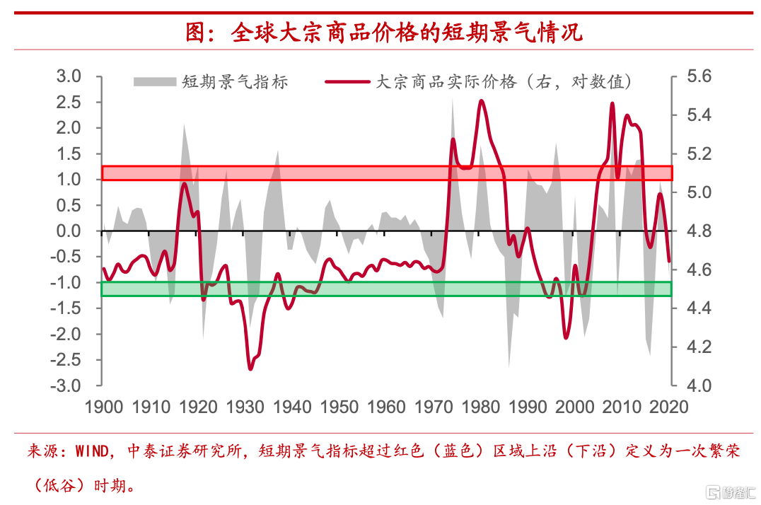 首先,從長期趨勢上來看,全球大宗商品實際價格中樞在一百多年的時間裏略有擡升。其次,全球大宗商品價格存在着較爲規律的週期波動,這一週期約爲30-35年左右,基本上等同於一輪房地產週期的長度,目前全球大宗商品價格仍處於週期下行期,根據對歷史價格的週期波動規律演繹,我們預計下一次價格低點很可能出現在2026年左右,距當前還有約四五年的時間。最後,短期景氣指標近來尚屬平穩,並沒有給出確定性的方向。
