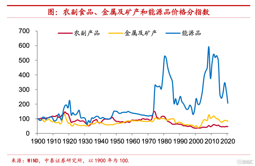 大宗商品一分爲三,不同類別規律有異。由於大宗商品所包含的種類較爲豐富,而不同類別商品價格變化遵循的規律又全然不同,因此,前文所描繪的大宗商品價格整體走勢事實上是不同類別商品價格變化疊加的結果。我們按照價格變動的不同特徵將本文樣本中的大宗商品劃分爲農副產品、能源品和金屬及礦產三類。下圖清楚地表明,1970年以來全球大宗商品實際價格波動性的加大主要來自於能源品的貢獻。