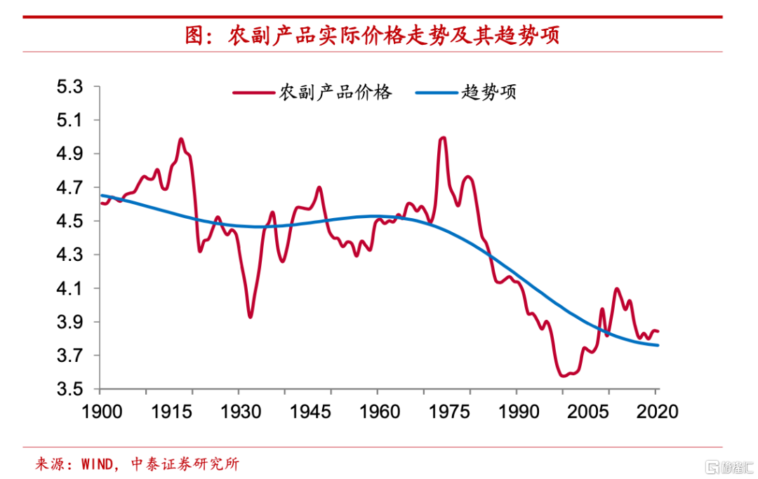 農副產品百年趨勢,實際價格有所下降。首先,我們來看農副產品的價格變化情況。從長期趨勢上來說,農副產品實際價格中樞在百年多的時間裏有着較爲顯著的下降。1900年時農副產品價格指數對數的趨勢項約爲4.65,而2020年時這一指標僅約爲3.76,大約是1900年水平的80%左右。