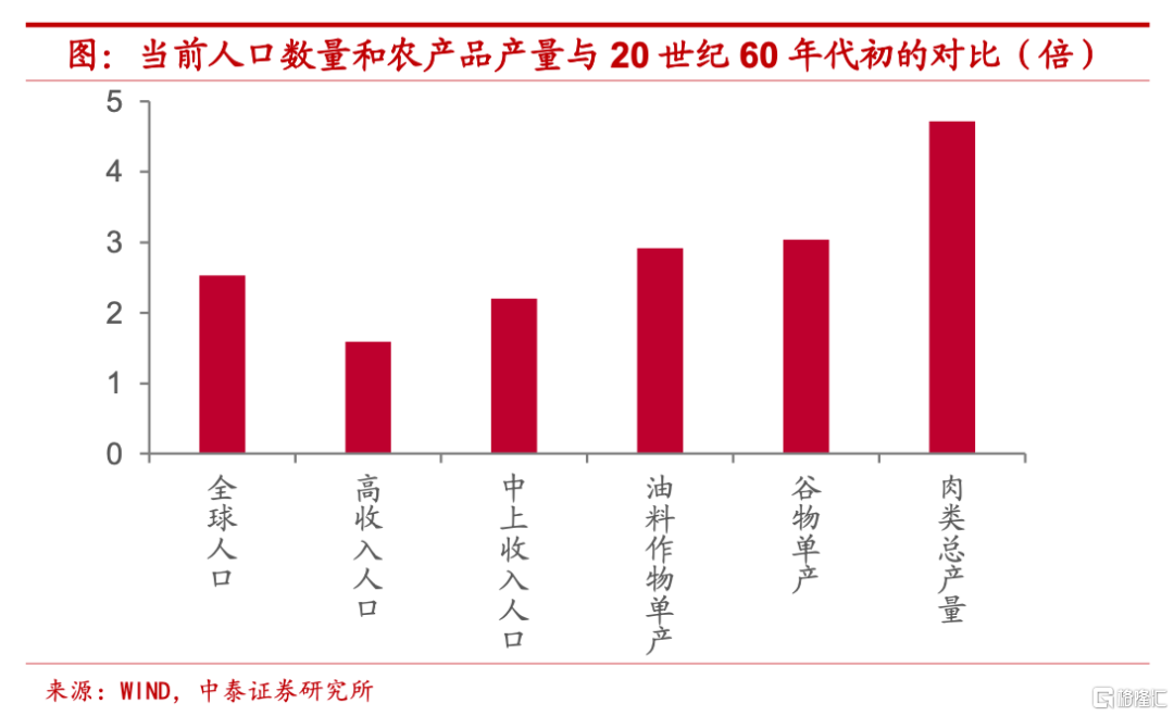 技術進步提升效率,單產增幅超過人口。之所以農副產品價格長期趨勢能夠有所下移,我們認爲,這主要應該歸功於技術進步所帶來的產出效率提升,由於農副產品多數來自於種植或者飼養培育,相比於其它兩大品類,技術進步帶來的農副產品產出增加並不會受到存量約束。2020年全球人口約是1960年的2.5倍左右,其中購買力較強的高收入經濟體人口和中等偏上收入經濟體人口分別是1960年的1.6倍和2.2倍,而2019年全球穀物和油料作物的單產大約是1961年的3倍左右,全球肉類總產量更是達到1961年的4.7倍。