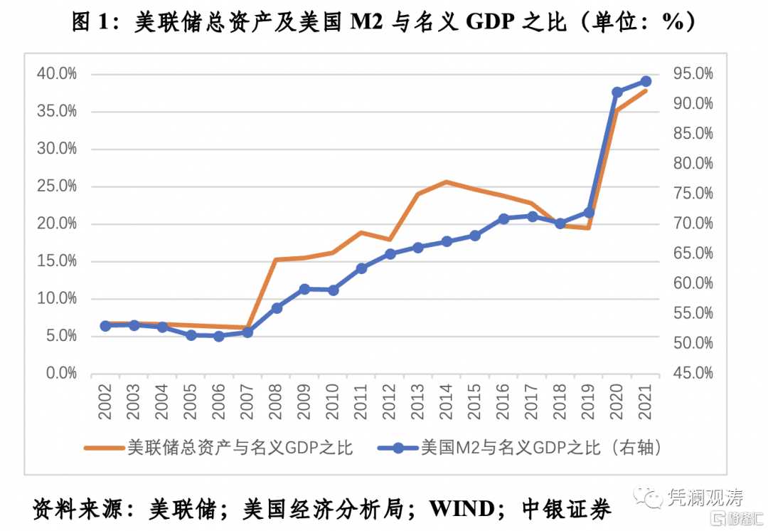 2008年金融危機應對,美國是以貨幣政策為主、財政政策為輔。當時,美聯儲“零利率+三輪量化寬鬆”,直到2014年初才啟動縮減購債,2015年底第一次加息,逐步退出量寬。到2014年底,美聯儲總資產與名義GDP之比為25.7%,較2007年底高出19.5個百分點,之後逐步回落,到2019年底降至19.4%;2008至2014年間,美國M2年均增長6.6%,較同期名義GDP年均增幅高出3.8個百分點,M2與名義GDP之比上升了15.2個百分點(見圖1)。