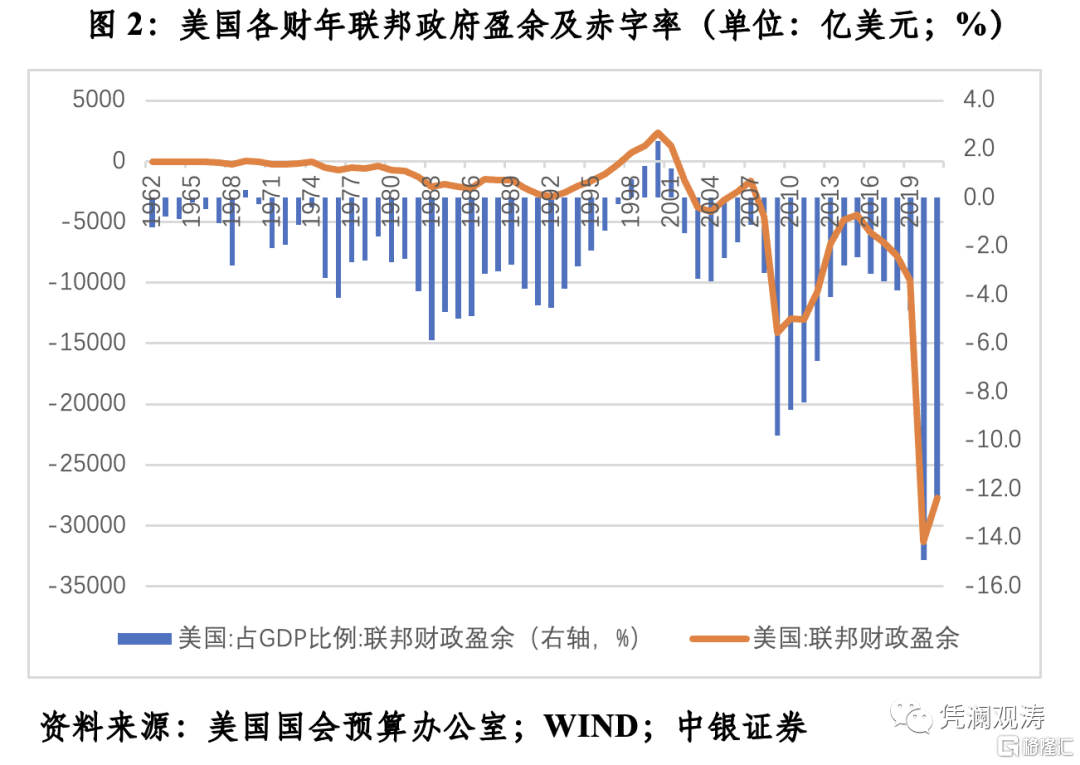 2020財年,美國聯邦政府赤字3.13萬億美元,較上年增長2.18倍,赤字規模為戰後最高,赤字率為14.9%,較上年上升10.3個百分點,赤字率也是刷新了戰後記錄。2021財年,美國聯邦政府赤字2.77萬億美元,略低於上年,赤字率為12.4%,為二戰後次高(見圖2)。