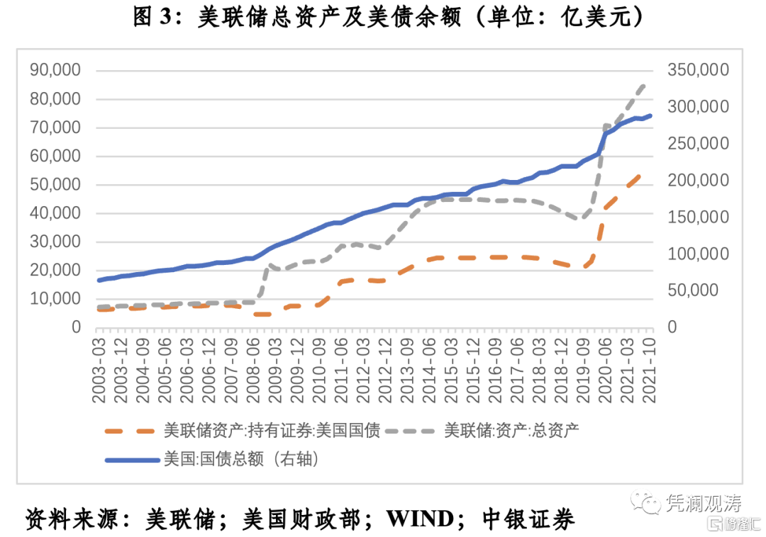 2008年危機時期的2008至2014年,美聯儲擴表3.61萬億美元。其中,淨增持美國國債1.7萬億美元,佔到美聯儲擴表的47.3%,相當於同期美債新增額19.2%。這次公共衞生危機暴發後,到今年10月底,美聯儲較2019年底擴表4.39萬億美元。其中,淨增持美債3.18萬億美元,佔到美聯儲擴表的72.5%,相當於同期美債新增額的55.8%(見圖3)。