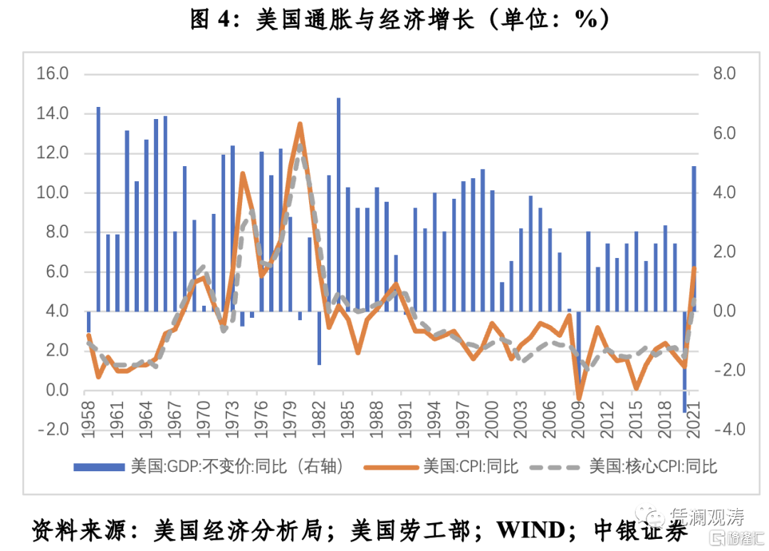上次美國出現兩位數的大通脹,發生在上世紀七八十年代的經濟滯脹時期,究其原因主要是貨幣超發和供給衝擊(1973-1974年和1979-1980年兩次石油危機)(見圖4)。