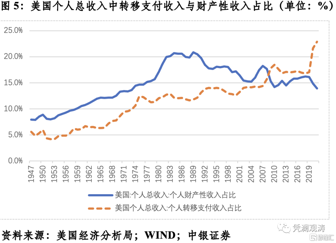 顯然,如果美聯儲加息,將增加政府融資成本,影響政府債務可持續性。而更為嚴重的後果是,如果“通脹暫時論”被證偽,也就意味着美聯儲行動落後於市場曲線,這將加劇貨幣緊縮預期。對此,美聯儲在11月份發佈的半年度金融穩定報吿中警吿稱,對通脹加劇和貨幣緊縮的擔憂已成為市場最關心的問題。如果投資者風險情緒惡化、遏制新冠疫情的進展令人失望,或者經濟復甦停滯,資產價格仍容易大幅下跌。鑑於財產性收入是美國居民個人收入的重要來源(見圖5),由此引發的負財富效應對美國經濟的負面影響將不容低估。