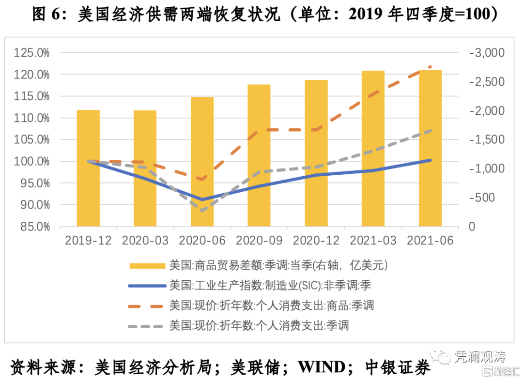 新冠疫情暴發初期,經濟大封鎖,供需兩端同時大幅收縮,造成通縮壓力。但隨着疫苗接種普及和疫情防控常態化,前期需求端因經濟衰退的通縮力量快速切換至經濟重啟的通脹力量,但供給收縮的通脹壓力卻未顯著改善。特別是美國補助家庭的政策穩住了消費需求,但缺乏有效的復工復產組織力,加劇了供需失衡。