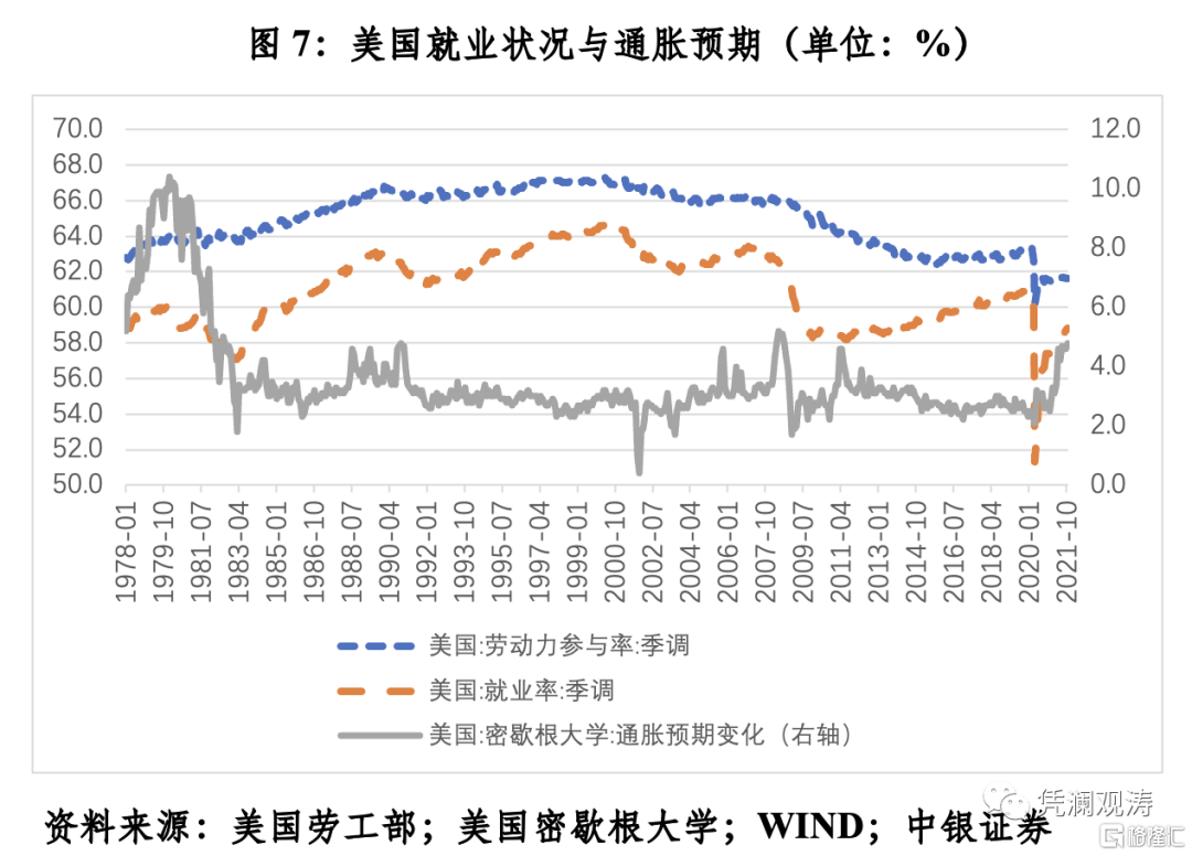 疫情蔓延疊加補貼政策的影響,還助長了美國企業招工難、用工貴問題。截至今年10月份,美國勞動參與率和就業率分別為61.6%和58.8%,較2019年底分別低1.7和2.2個百分點。受此影響,三季度,美國國內勞動者薪資指數同比增長4.2%,為過去二十年來最高。目前,無論CPI還是PCE的同比增速均高出同期的薪資增長,疊加通脹預期上行,最終可能釀成“工資—物價”的螺旋式上升(見圖7)。