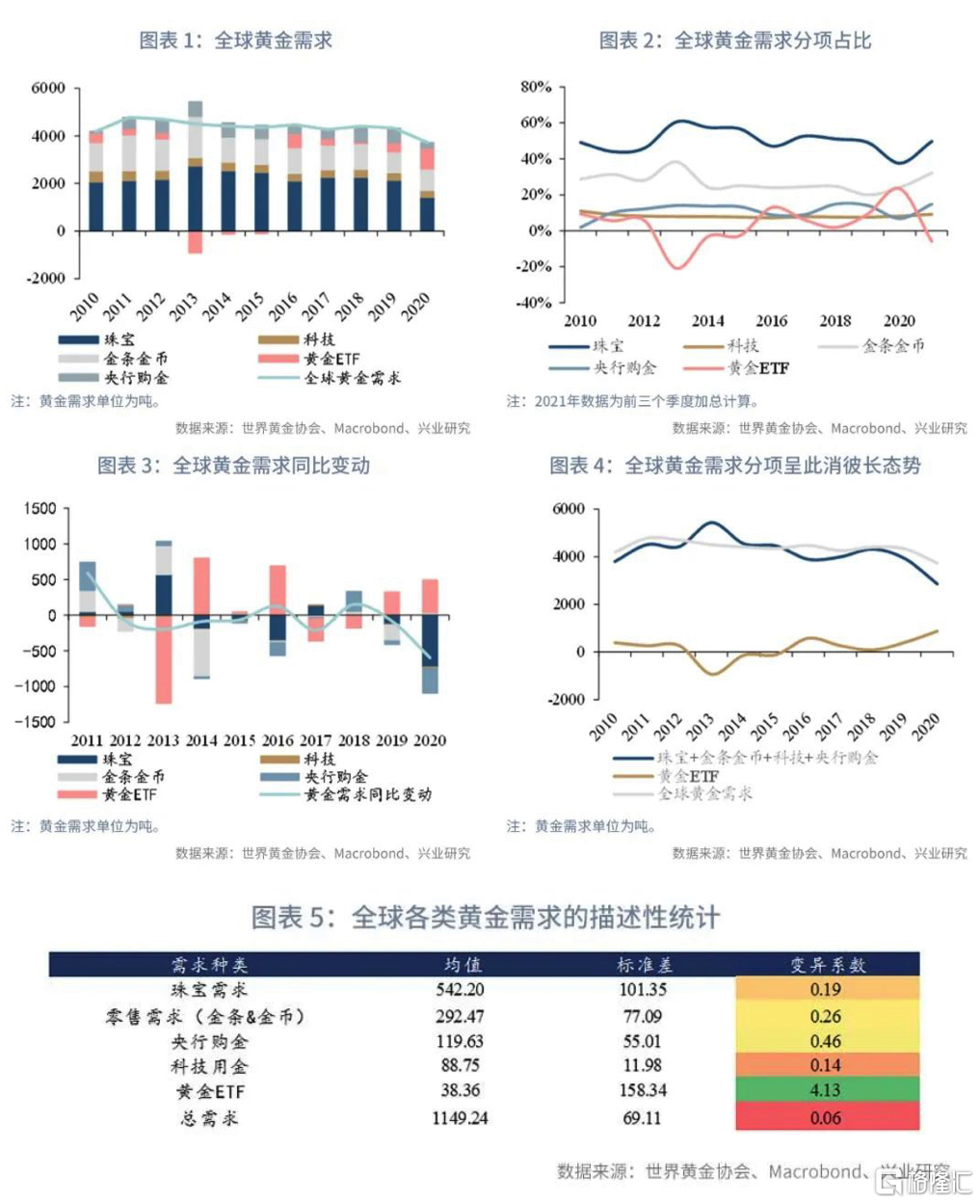 2010年來黃金ETF需求的標準差達到了158噸/季度,為五個分項需求中最高,變異係數也達到4.13,遠高於珠寶、零售、央行購金以及科技用金的0.19、0.26、0.46和0.14。相比之下總需求較穩定,變異係數僅為0.06(詳見圖表 1至圖表 5)。