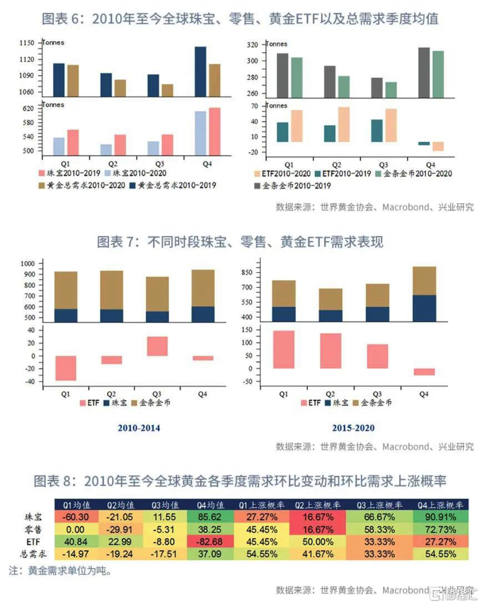 全球黃金需求由珠寶、零售(金條&金幣)、央行購金、科技用金和黃金ETF五部分構成。黃金ETF需求與實物需求呈現出一定的此消彼長之勢。