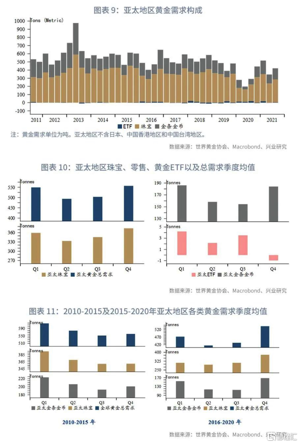 2010年至今,亞太地區的珠寶、零售(金條金幣)、黃金ETF需求佔該地區總需求比例 [1] 平均為67.1%、32.4%和0.4%。亞太地區珠寶和零售需求佔全球珠寶需求量的64%以及全球金條金幣需求量的58%,黃金ETF需求平均僅佔全球黃金ETF需求的0.14%。