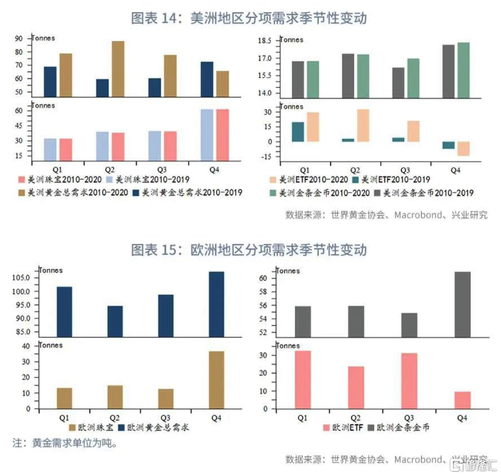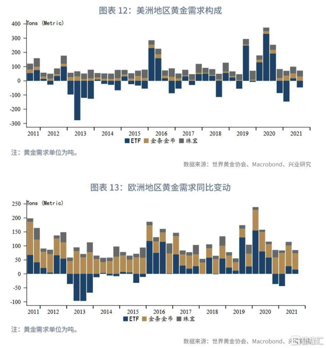 2010年以來美洲地區在珠寶、零售(金條金幣)和黃金ETF需求佔該地區總需求比例平均為58%、25%和17%。歐洲地區零售需求佔比更高,2010以來歐洲地區珠寶、零售和黃金ETF需求佔該地區總需求比例平均為19%、58%和23%。