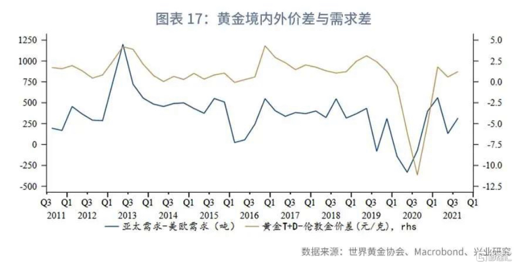 亞太地區與美歐地區黃金需求的差異與境內外價差呈現出較好的同步性。相較於兩者與金價走勢的負相關係,兩者差異與境內外價差的正向同步性更好理解。亞太需求相對於歐美回升,帶動境內黃金相對境外金價溢價走擴或者折價收斂,反之亦然。