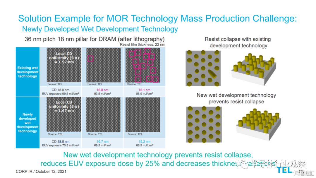 同樣,Tokyo Electron 和 JSR 擁有新的濕法開發工藝,可以抵抗支柱倒塌(pillar collapse )問題。36nm 支柱經常崩塌,這是 DRAM 中電容器縮放的最大挑戰之一。新的顯影工藝也適用於較低的 EUV 劑量,並減少了最終特徵的厚度變化。