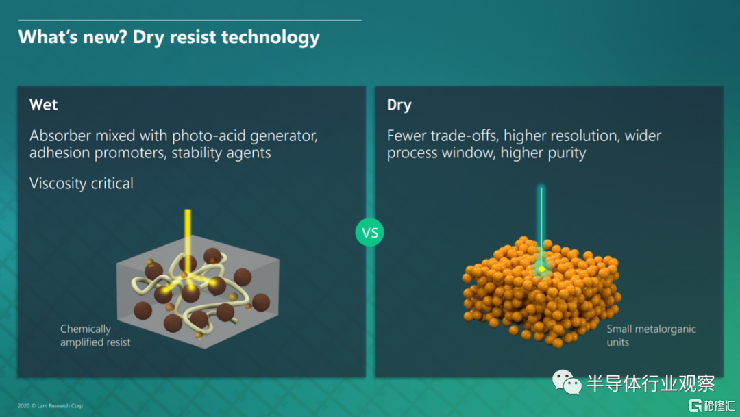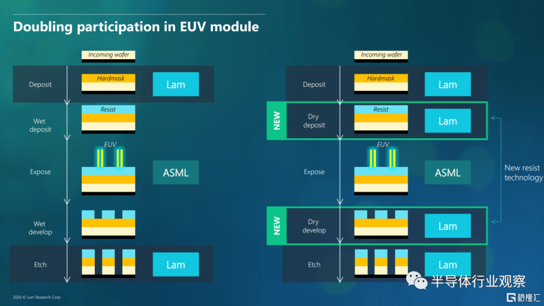 Lam Research 正試圖成為當中的攪局者。他們將使用化學氣相沉積工藝在金屬光刻膠上分層,而不是使用旋塗機的濕式光刻膠(wet photoresist )技術。Lam Research聲稱乾式光刻膠技術(dryresist )與濕式光刻膠相比具有多項優勢。由於是一種密集沉積的金屬(metal),它不會與許多其他化學物質混合。這允許金屬光刻膠僅作為吸收劑。回到吞吐量,這意味着每個晶圓通過和功率降低了 2 倍。每台 EUV 工具吞吐量幾乎翻倍,這將大大降低成本。