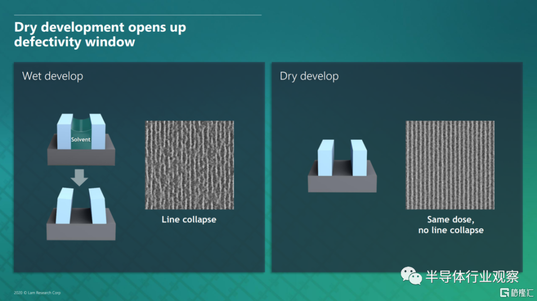 靈敏度並不是唯一的優勢。Lam 的乾式光刻膠也是採用幹法開發的。在濕顯影中,光刻膠用水或酸洗滌。當光刻膠由於毛細作用力溶解掉時,圖案化的線條和其他特徵可能會坍塌。隨着最小金屬間距 (MMP) 超過 28 納米,這越來越成為一個問題。台積電的 N5 和 N4 工藝節點的 MMP 分別為 30nm 和 28nm,因此當前的出貨節點正好處於邊緣。