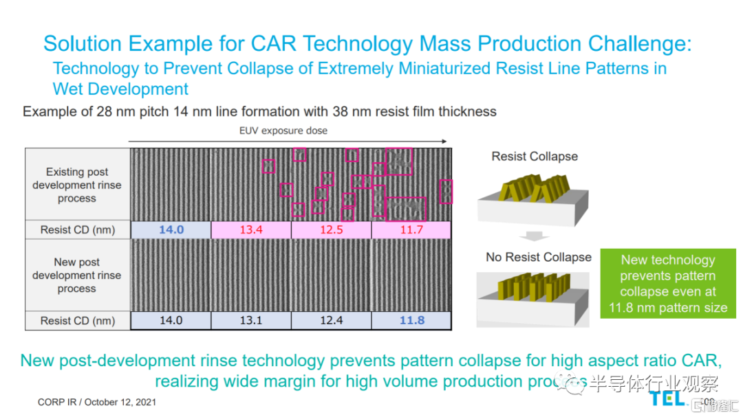 然而,東京電子仍有創新在進行中。雖然他們同意現有的開發沖洗工藝確實會導致超過 28nm 間距(14nm 臨界尺寸)的生產線塌陷,但他們發現了一種新的溶劑沖洗工藝,可以將其擴展到 ~24nm(12nm 臨界尺寸)。這將允許將濕抗蝕劑方法縮放到 24 納米。