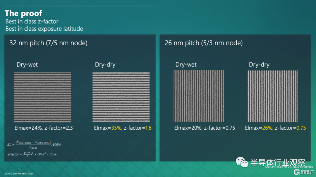 Lam Research 聲稱他們的工藝可以實現 5nm 節點上使用的現有 32nm 間距,與現有的濕式光刻膠工藝相比,其方案具有更低的可變性和更好的寬容度。我們無法與 Lam Research 分享的硬性數字進行爭論。當晶圓廠追求特徵尺寸、性能和功耗時,幹法工藝總體上更好。由於顯示了當前部署的工具和流程與即將推出的工具和流程,因此 Lam Research 進行的比較可能被認為是不誠實的。
