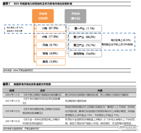 2021年10月11日,國家發改委印發《關於進一步深化燃煤發電上網電價市場化改革的通知》。其主要內容包括:1)有序放開全部燃煤發電電量上網電價。燃煤發電電量原則上全部進入電力市場,通過市場交易在“基準價+上下浮動”範圍內形成上網電價。現行燃煤發電基準價繼續作爲新能源發電等價格形成的掛鉤基準。2)擴大市場交易電價上下浮動範圍。將燃煤發電市場交易價格浮動範圍由現行的上浮不超過10%、下浮原則上不超過15%,擴大爲上下浮動原則上均不超過20%,高耗能企業市場交易電價不受上浮20%限制。電力現貨價格不受上述幅度限制。3)推動工商業用戶都進入市場。各地要有序推動工商業用戶全部進入電力市場,按照市場價格購電,取消工商業目錄銷售電價。目前尚未進入市場的用戶,10千伏及以上的用戶要全部進入,其他用戶也要儘快進入。4)保持居民、農業用電價格穩定。居民(含執行居民電價的學校、社會福利機構、社區服務中心等公益性事業用戶)、農業用電由電網企業保障供應,執行現行目錄銷售電價政策。各地要優先將低價電源用於保障居民、農業用電(圖表1)。
