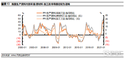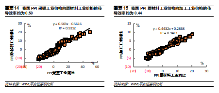 從間接渠道來看,採掘——原材料——加工的價格傳導較爲順暢(圖表13)。根據2013年以來的歷史數據估算,採掘行業PPI每上漲1%將帶動原材料行業PPI上漲0.50%(圖表14),原材料行業PPI每上漲1%將帶動加工行業PPI上漲0.44%(圖表15)。