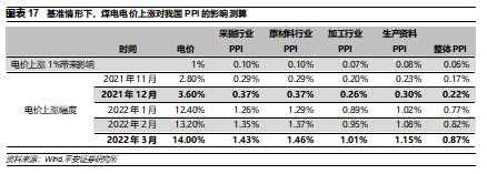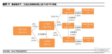 按不同領域在生產資料及PPI中的權重計算(採掘、原材料、加工工業在生產資料PPI中的權重分別爲5.2%、26.6%、68.2%,生產資料在總體PPI中的權重爲75.6%),平均工業用電價格每上漲1%,將帶動生產資料PPI同比上漲0.082%,整體PPI同比上升0.062%(圖表16)。