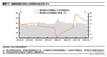 本次改革明確規定“高耗能行業市場交易電價不受上浮20%限制”。截至今年9月,石油、煤炭及其他燃料加工業,化學原料和化學制品製造業,非金屬礦物製品業,黑色金屬冶煉和壓延加工業,有色金屬冶煉和壓延加工業等五大高耗能行業累計用電1.77萬億千瓦時,在工業用電中佔比達到44.1%(圖表18)。並且,高耗能行業與PPI生產資料中原材料行業基本重合,處於生產的中上遊,具備較強的議價能力,容易將生產成本向下轉移。在煤價高漲、電廠發電成本倒掛的情況下,高耗能行業可能承受更大的電價漲幅。